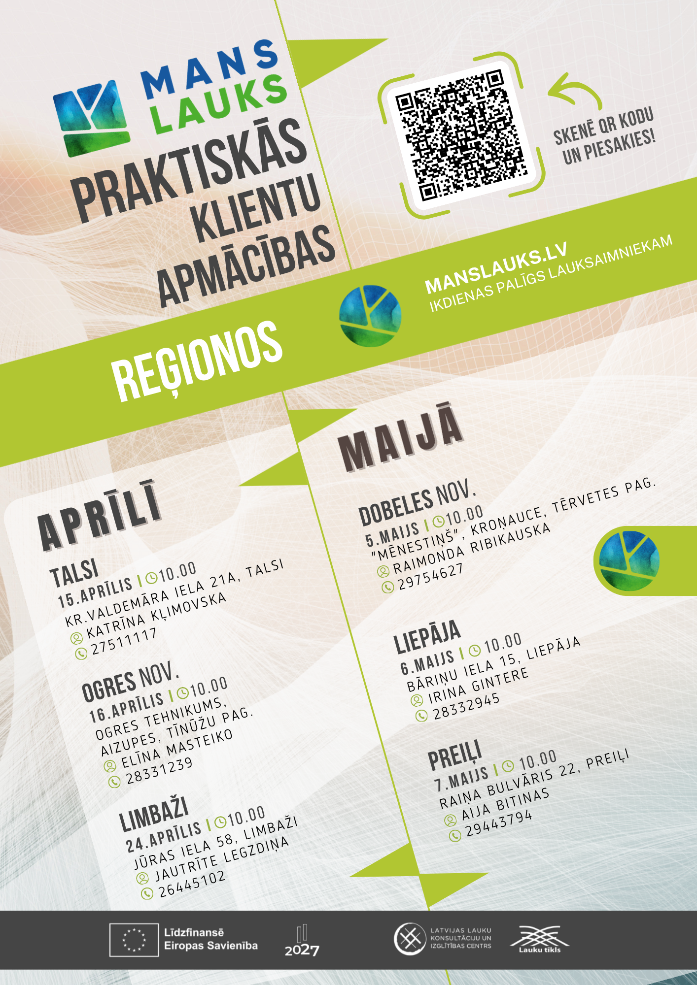 Lauksaimnieki visā Latvijā aicināti piedalīties klātienes praktiskajās apmācībās par lauku saimniecību pārvaldības sistēmu “Mans Lauks”. Apmācības paredzētas gan saimniecību īpašniekiem, gan darbiniekiem, ja tie ikdienā plāno strādāt ar sistēmu “Mans Lauks”. Katram dalībniekam ir iespēja izvēlēties sev ērtāko norises vietu un laiku.