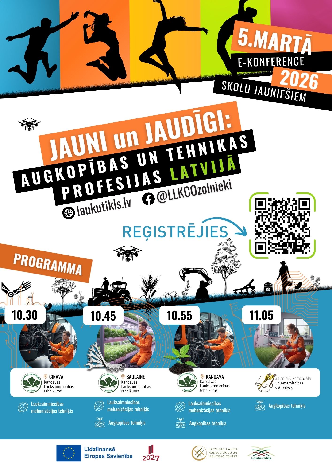 Lai veicinātu paaudžu nomaiņu Latvijas lauksaimniecībā, 5. martā no plkst. 10.30 līdz 11.15 tiešsaistē vienas mācību stundas garumā notiks e-konference pamatskolu skolēniem “Jauni un jaudīgi: augkopības un tehnikas profesijas Latvijā 2026”.