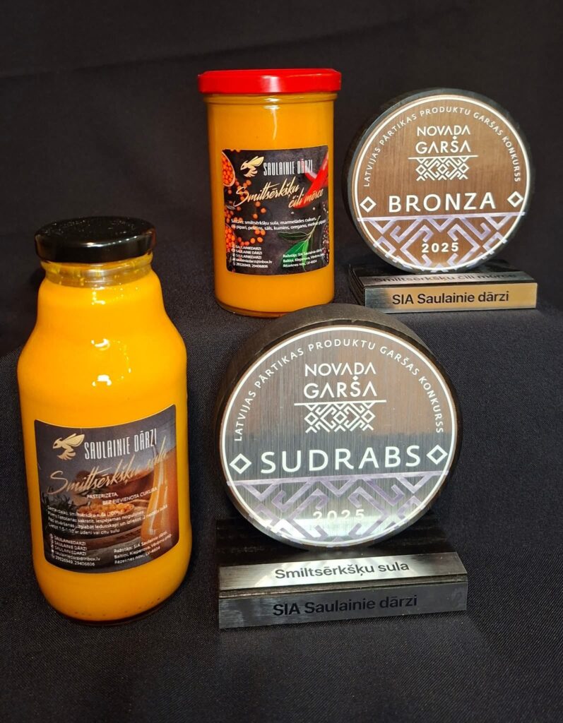 SIA “Saulainie dārzi” piedalās Latvijas mazo pārtikas ražotāju un mājražotāju pārtikas produktu kvalitātes konkursā “Novada Garša”, kurā tiek godāti produkti ar izcilu garšu, kvalitāti un vietējo izejvielu izmantojumu. Konkursam iesniegtos produktus vērtē vairāki eksperti – profesionāli pavāri, pārtikas tehnologi un citi speciālisti. Rezultāti lieliski! 2025. gadā iegūta bronzas medaļa par produktu Smiltsērkšķu čili mērce, bet smiltsērkšķu sulai – sudraba godalga.