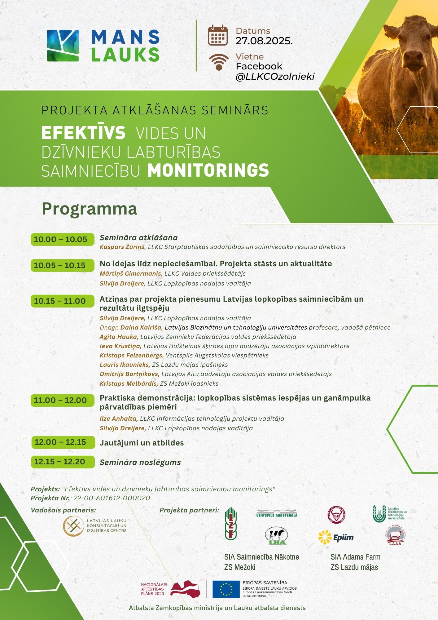 Latvijas Lauku konsultāciju un izglītības centrs sadarbībā ar projekta partneriem jauno risinājumu, kas izstrādāts projekta “Efektīvs vides un dzīvnieku labturības saimniecību monitorings” ietvaros, prezentēs atklāšanas seminārā 27. augustā, plkst. 10.00 tiešsaistē Facebook profilos @LLKCOzolnieki un @Manslauks, kā arī LLKC mājaslapā wwww.laukutikls.lv.