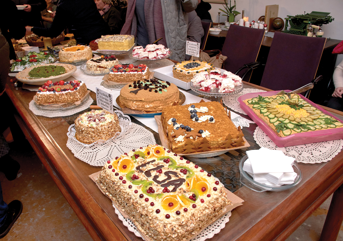 Notika mielošanās pie ugunskura zupas katla ārā, pirmajā stāvā varēja cienāties ar īsto latvju saimnieču spēcīgajiem ēdieniem un našķoties ar 25 dažādām kūkām. To vidū bija viešņu atvestās un vietējo ceptās, arī zorģenieces Ritas Rasnes torte pēc populārās Kaucmindes receptes parauga, kuru zina arī jaunieši.