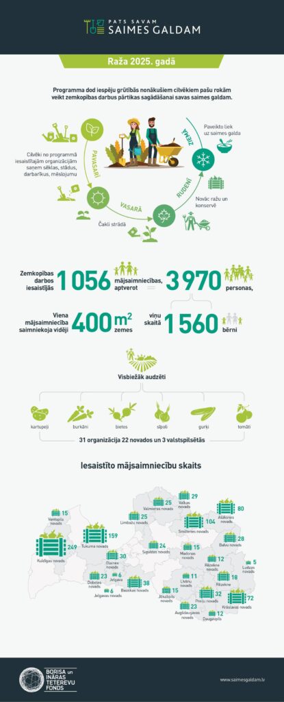 Šogad dārzkopības projektos iesaistījās 1056 mājsaimniecības, aptverot 3970 personas – gan pieaugušos, gan bērnus no visiem Latvijas reģioniem. Dārza darbiem nepieciešamo ļaudis saņēma no 31 bezpeļņas organizācijas, kas ieguva fonda atbalstu. Piedaloties šajos projektos, cilvēki pašu rokām audzēja pārtiku savai un savas ģimenes labklājībai. Kopumā tika īstenoti: 7 projekti Kurzemē, 10 – Vidzemē, 6 – Zemgalē, 7 – Latgalē un viens projekts aptvēra Sēlijas un Latgales reģionu. Šogad Borisa un Ināras Teterevu fonds šīs programmas grantos piešķīris 59 350 eiro. Selekcionāra Pētera Upīša biedrības projektā “Dobeles un Bauskas dārzos kopā strādāt jautrāk 2025!” atbalstu saņēma 20 ģimenes Dobeles un Bauskas novados, kopskaitā 47 pieaugušie un 66 bērni. Lai pašu spēkiem izaudzētu un piepildītu pagrabus ar pārtiku ziemas krājumiem, ģimenes saņēma sēklas, dārzkopības inventāru, augļu koku un ogu krūmu stādus, kā arī rokasgrāmatu ražīgai saimniekošanai mazdārziņos un dažādu recepšu apkopojumu.