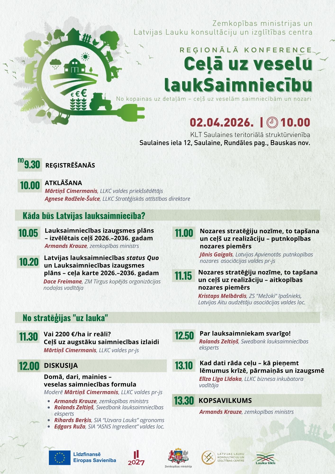 2026. gada 2. aprīlī Rundāles pagasta Saulainē norisinājās Zemkopības ministrijas un Latvijas Lauku konsultāciju un izglītības centra rīkotā Zemgales reģionālā konference “Ceļā uz veselu laukSaimniecību”, kas pulcēja lauksaimniekus, ekspertus un politikas veidotājus no visas Latvijas. Konferencē tika diskutēts par Latvijas lauksaimniecības izaugsmes plānu 2026.–2036. gadam, nozares attīstības virzieniem un saimniecību stabilitāti mainīgajos tirgus apstākļos. Pasākumā īpaša uzmanība tika pievērsta arī praktiskiem risinājumiem efektīvākai saimniekošanai, datu izmantošanai un produktivitātes palielināšanai. Dalībnieki uzsvēra sadarbības, pieredzes apmaiņas un pašu lauksaimnieku iniciatīvas nozīmi nozares ilgtspējīgā attīstībā. Konference noslēdza ZM reģionālo diskusiju ciklu, iezīmējot kopīgu redzējumu par Latvijas lauksaimniecības nākotni un konkurētspēju.