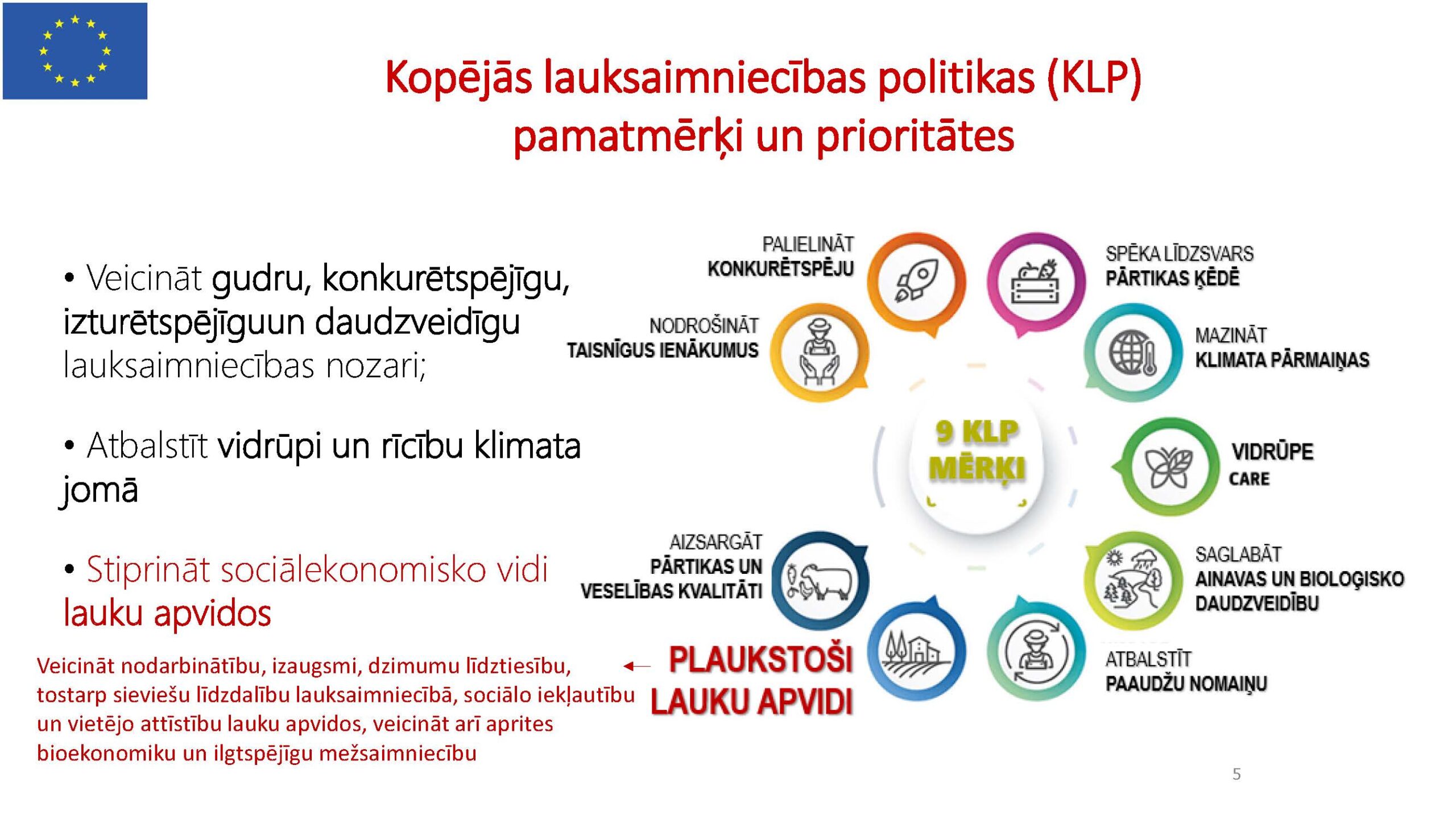 KLP galvenais mērķis joprojām saglabājas pārtikas ražošana, vienlaikus veicinot ilgtspējīgu lauksaimniecības praksi un dabas resursu apsaimniekošanu, sniedzot ieguldījumu Zaļā kursa mērķu izpildē, kā arī atbalstot lauku teritoriju sociālekonomisko attīstību, uzņēmējdarbību, inovāciju izstrādi un ieviešanu, kā tas ir paredzēts apstiprinātajā Latvijas KLP stratēģiskajā plānā 2023.–2027. gadam (KLP SP).