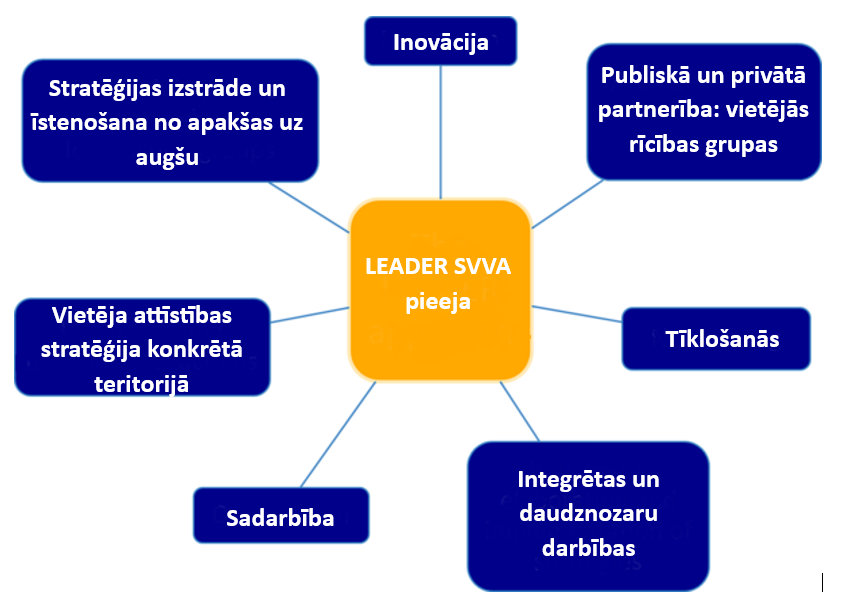 LEADER/SVVA ir pasākums, kura ieviešanas process ir tikpat svarīgs kā sasniedzamie skaitliskie rezultāti. Respektīvi, viens no būtiskākajiem LEADER rezultātiem ir pareizs ieviešanas process. Atšķirībā no tradicionālākiem politikas pasākumiem tajā ir norādes uz to, “kā” darboties, nevis “kas” jādara. LEADER/SVVA pieeju veido septiņi cits citu papildinoši principi: