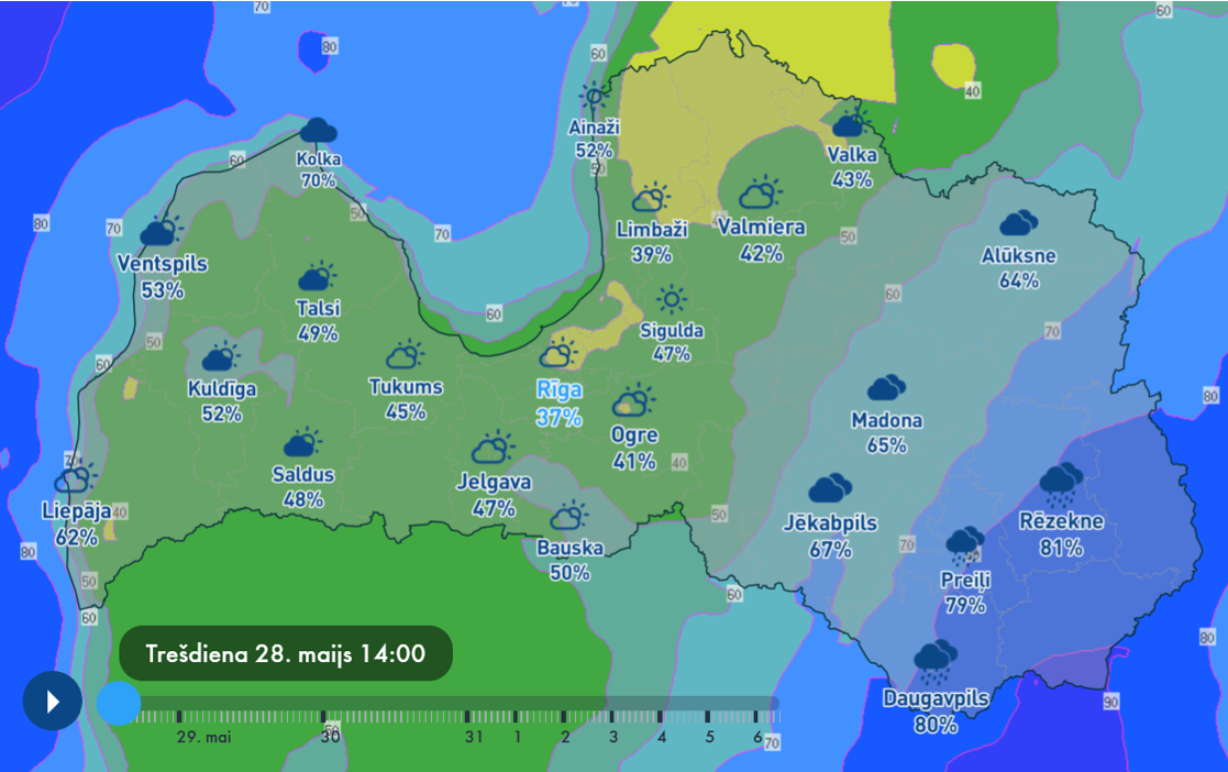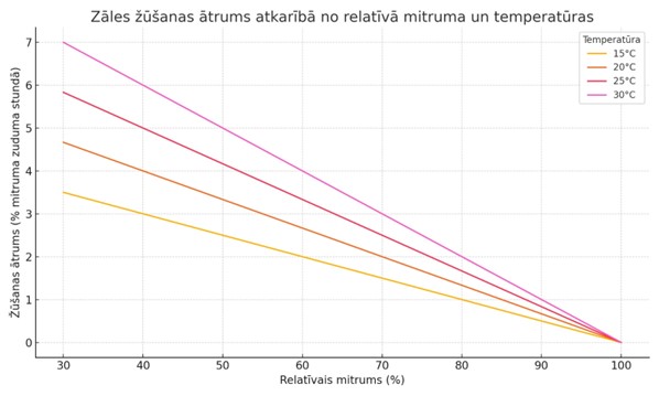 Apmeklējot saiti videscentrs.lvgmc.lv, var redzēt gan temperatūras, gan mitruma prognozes. Patlaban izskatās, ka pļaut būs iespējams tikai Dobeles pusē. Ar zāles žūšanu ir problēmas. Zāles žūšanas ātrums samazinās, palielinoties relatīvajam gaisa mitrumam, un to ietekmē temperatūra: