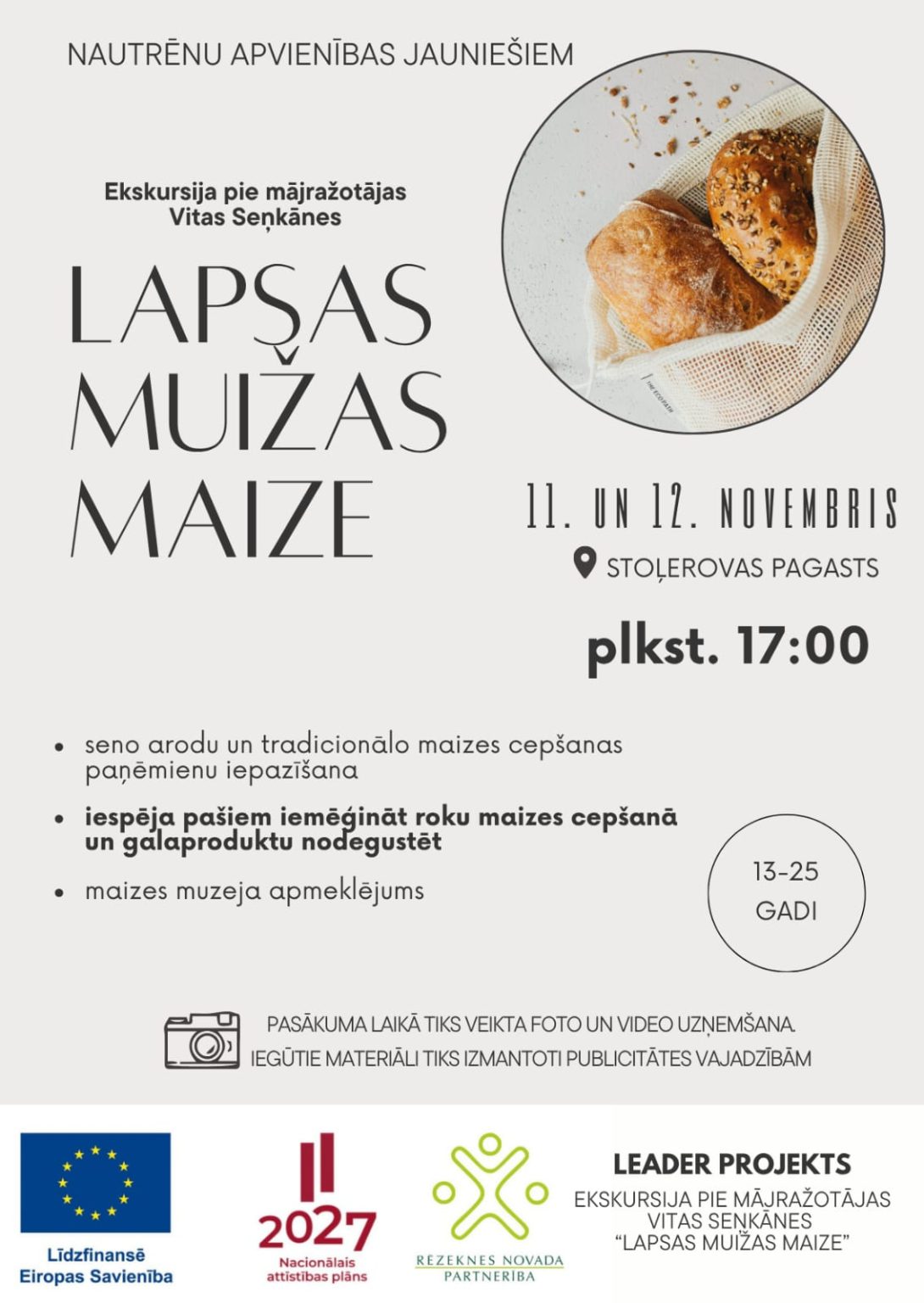 Nautrēnu apvienības jaunieši aicināti pieteikties maizes ceptuves apmeklējumam Rēzeknes novadā Klātiene Nozare/joma: Izglītība/pieredzeMājražošana Veids: Saimniecību un mežu apmeklējumi Norises laiks: 11/11/2025 12/11/2025 17:00 Norises vieta: Latgale Liepu iela 2a, Rosica, Stoļerovas pagasts, Rēzeknes novads