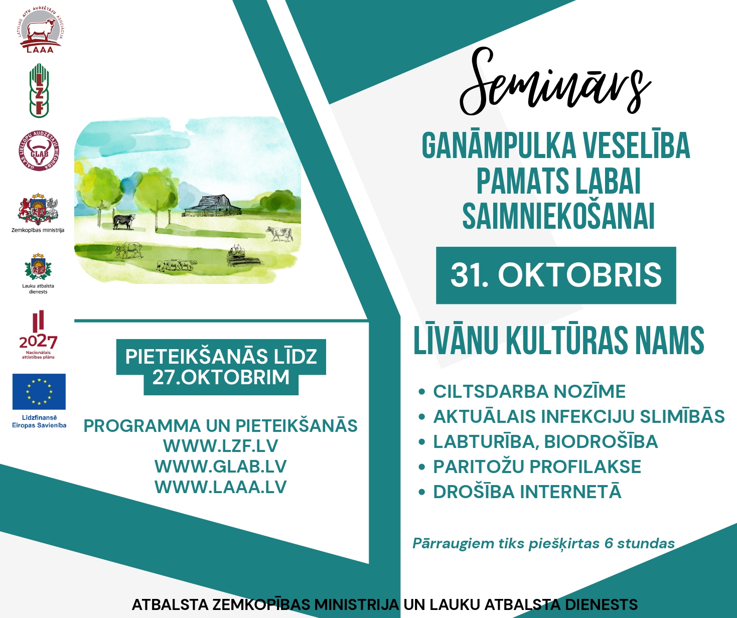 Biedrība “Latvijas Zemnieku federācija” sadarbībā ar biedrībām “Gaļas liellopu audzētāju biedrība” un “Latvijas Aitu audzētāju asociācija” aicina uz semināru lopkopjiem (atgremotāju sugām), kurā kopīgi pārrunāsim, kā ar vienkāršiem un pārbaudītiem paņēmieniem rūpēties par savu ganāmpulku, lai dzīvnieki būtu veseli, saimniecība ienesīga un darbs vieglāks.