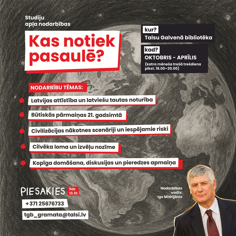 No oktobra līdz aprīlim Talsu Galvenās bibliotēkas telpās notiks bezmaksas studiju apļa nodarbības „Kas notiek pasaulē?” par dziļākiem procesiem XXI gadsimtā: par dabas un sociālo likumsakarību pamatojumos balstītām varbūtībām, kādus ienes vēsturiski pagriezieni.