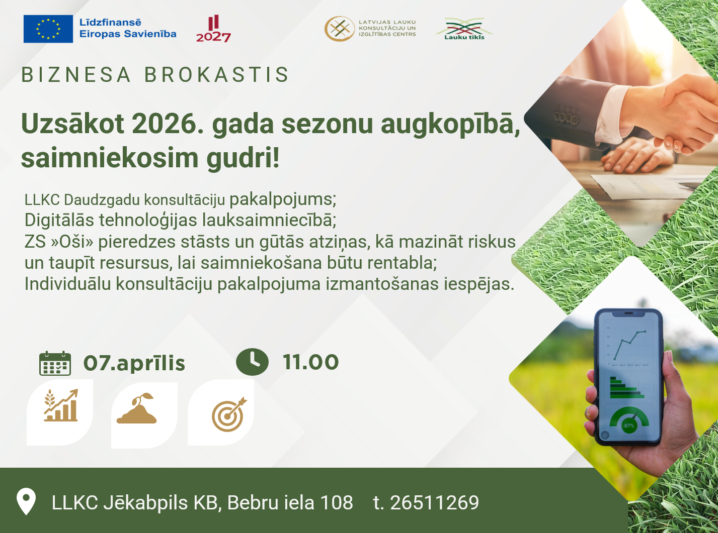 Saskaņā ar Latvijas Republikas Zemkopības ministrijas un SIA „Latvijas Lauku konsultāciju un izglītības centrs” 05.02.2026 noslēgto līgumu nr. 2026/30 no 05.02.2026. Aktivitāte „Informēšanas aktivitātes lauksaimniekiem par KLP un citām finansēšanas iespējām (Informatīvie semināri lauksaimniecībā)”