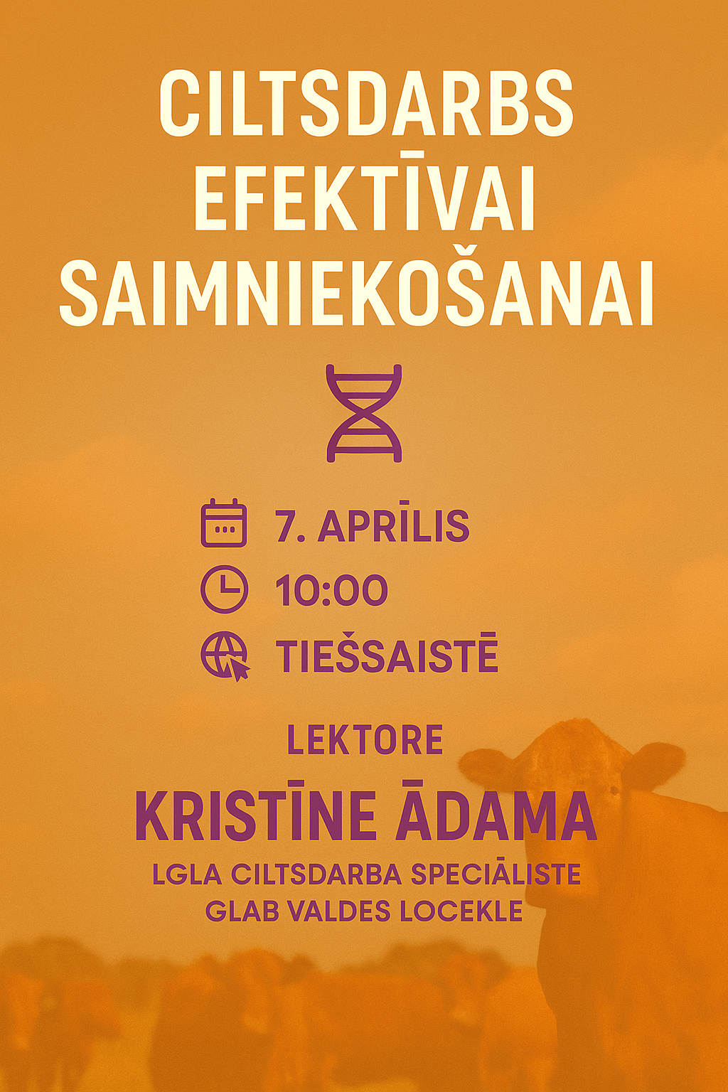 Lektore: Kristīne Ādama, Latvijas Gaļas liellopu audzētāju asociācija (LGLA) ciltsdarba speciāliste, Gaļas liellopu audzētāju biedrība (GLAB) valdes locekle.