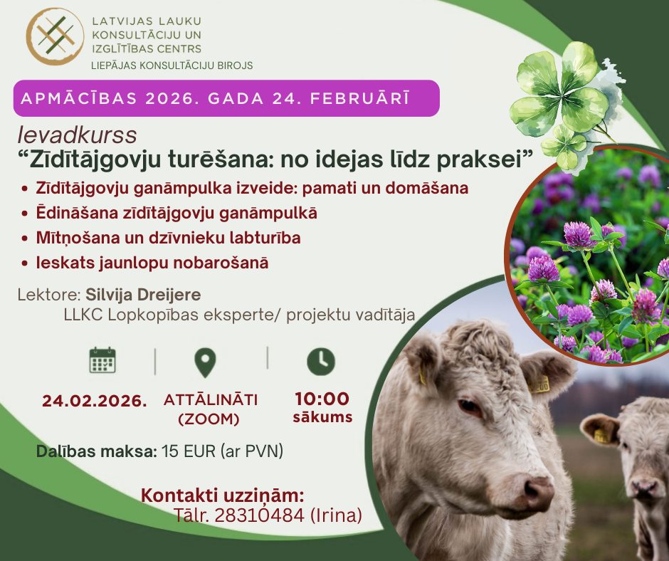 LLKC Liepājas konsultāciju birojs aicina uz tiešsaistes (ZOOM) maksas apmācībām “Zīdītājgovju turēšana: no idejas līdz praksei”.