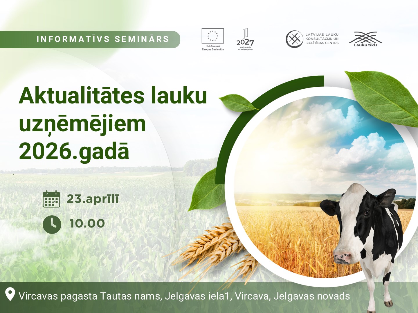 LLKC Jelgavas birojs aicina lauksaimniekus un lauku uzņēmējus uz bezmaksas informatīvo semināru “Aktualitātes lauku uzņēmējiem 2026.gadā”.
