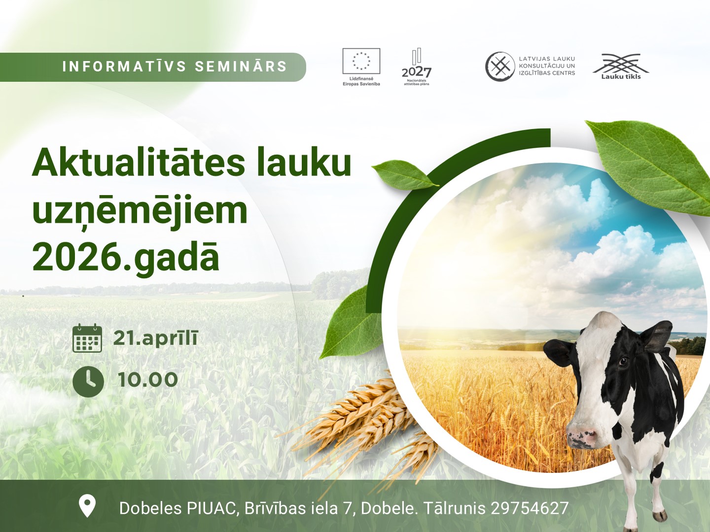 LLKC Dobeles birojs aicina lauksaimniekus un lauku uzņēmējus uz bezmaksas informatīvo semināru “Aktualitātes lauku uzņēmējiem 2026.gadā”.
