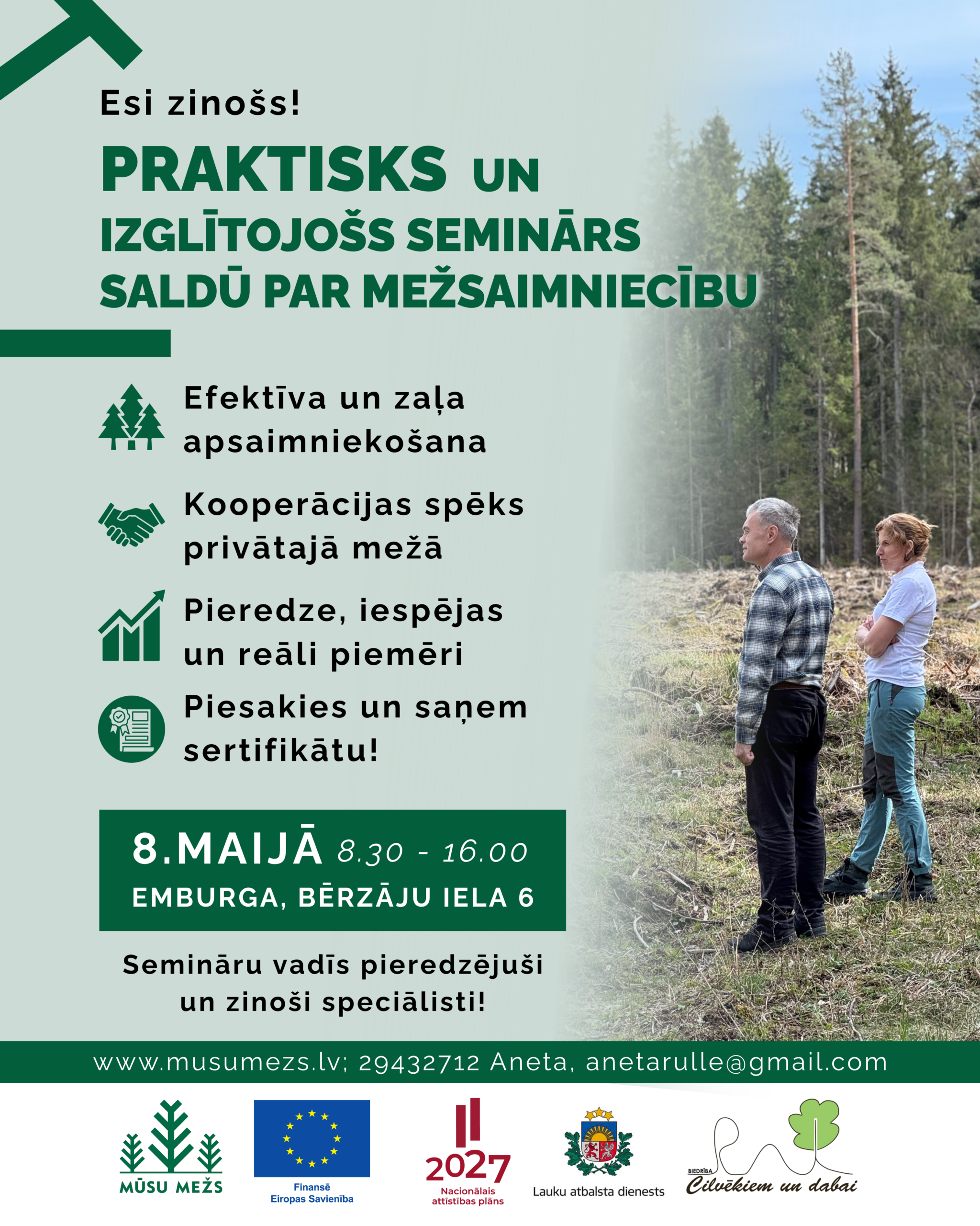 Šis būs vērtīgs un saturīgs pasākums ikvienam, kurš vēlas gudrāk apsaimniekot savu meža īpašumu, izprast ilgtspējīgas mežsaimniecības principus un iepazīt kooperācijas priekšrocības privātajā mežsaimniecībā. Semināra laikā dalībnieki dzirdēs gan ekspertu lekcijas, gan saņems praktiskus ieteikumus darbam savā mežā.