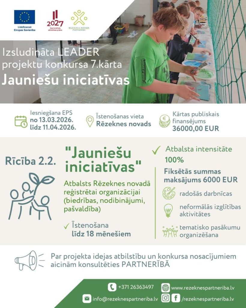 Biedrība “Rēzeknes novada partnerība” izsludina atklāta LEADER projektu iesniegumu konkursa pieteikšanās 7. kārtu jauniešu iniciatīvas projektiem ar kopējo publisko ELFLA finansējumu 36000,00 EUR.