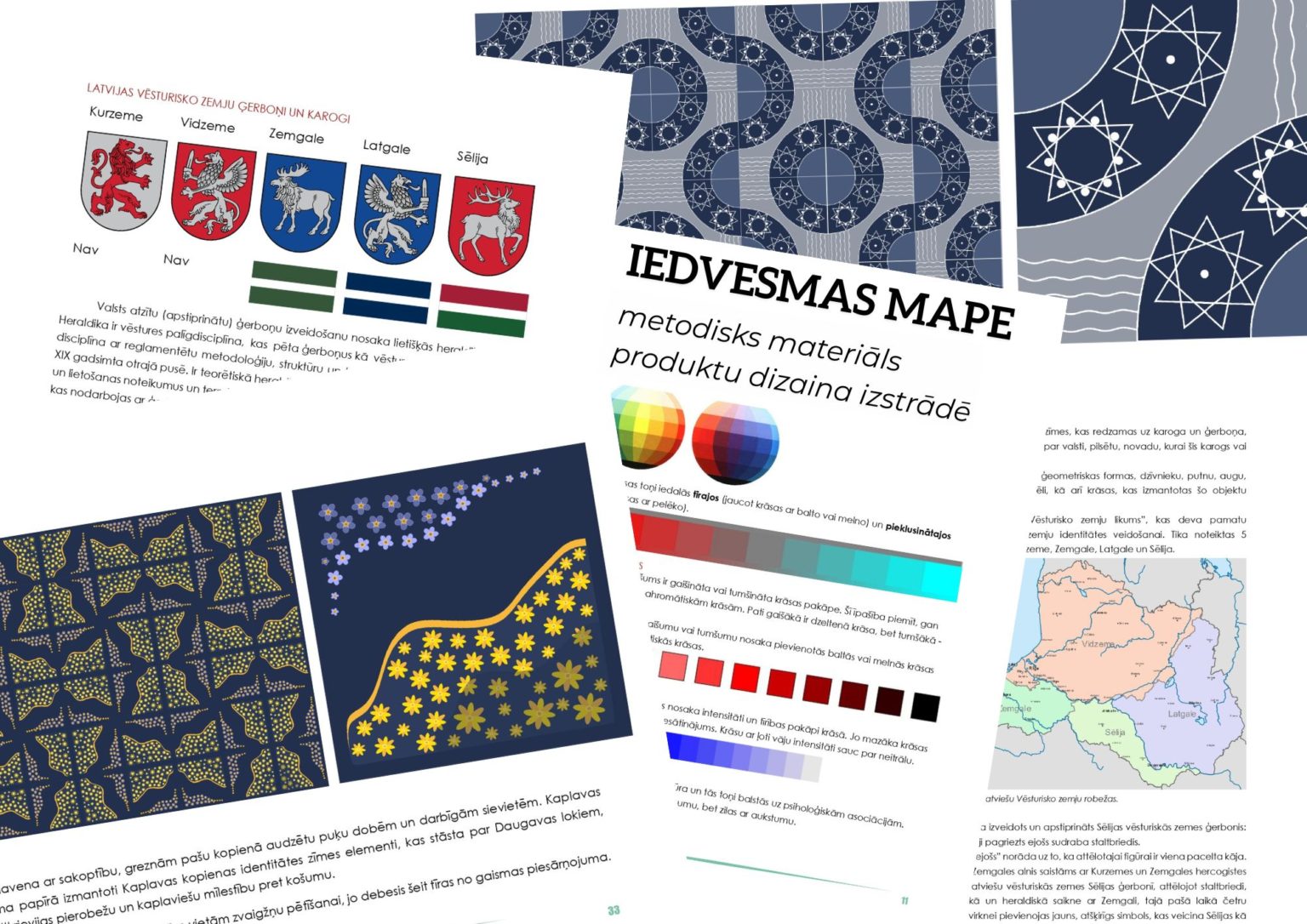 Biedrības “Ūdenszīmes” metodiskajā materiālā “Iedvesmas mape” ietverti vizuālās mākslas pamatprincipi un to pielietojuma piemēri amatniecībā, mājražošanā un savu produktu izplatībā. Ieteikumi produktu dizaina veidošanā balstīti vietas identitātē, izceļot latviešu vēsturisko zemju un lauku kopienu vērtības.