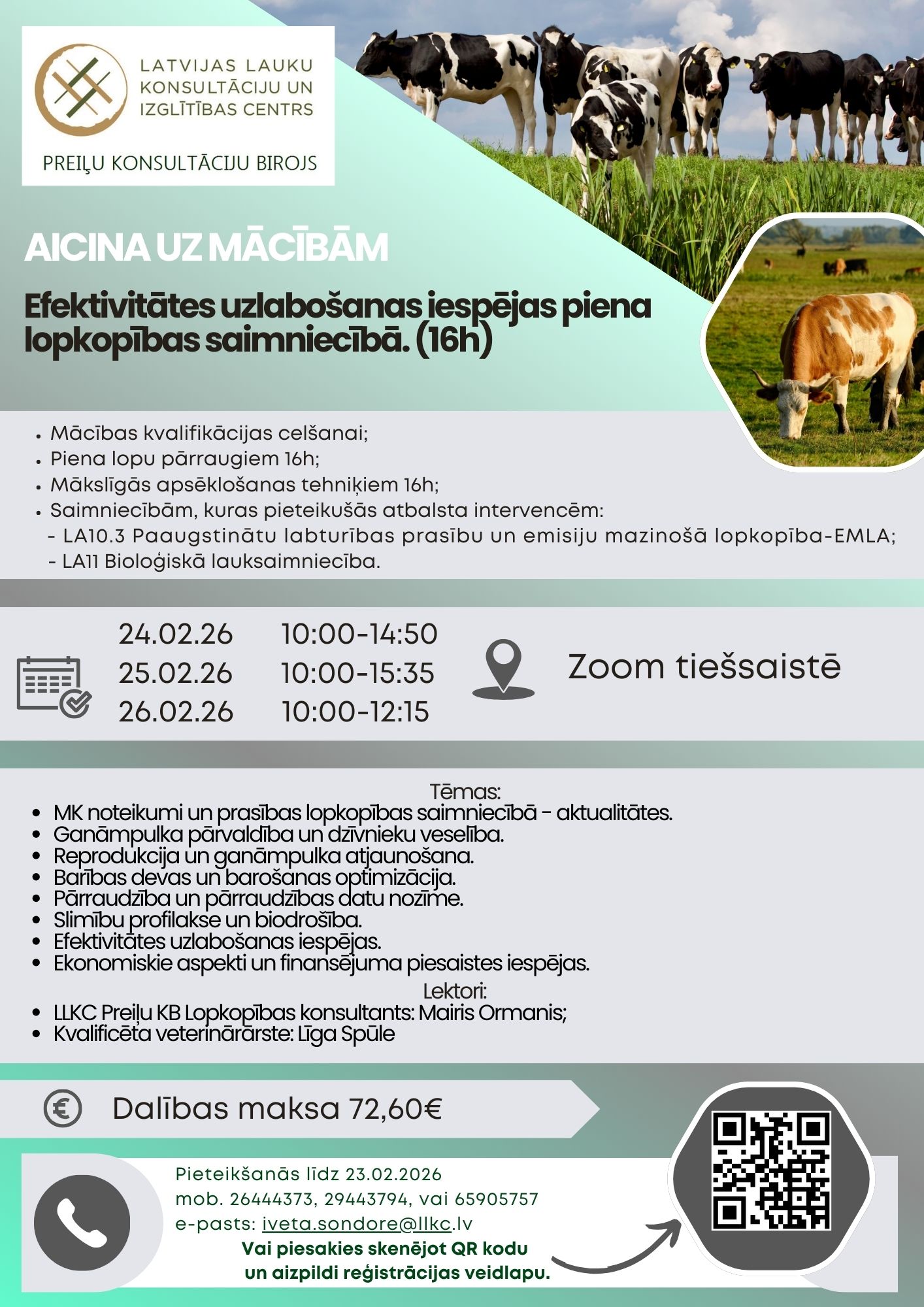 LLKC Preiļu konsultāciju birojs aicina uz mācībām: Efektivitātes uzlabošanas iespējas piena lopkopības saimniecībā. ( 16H)