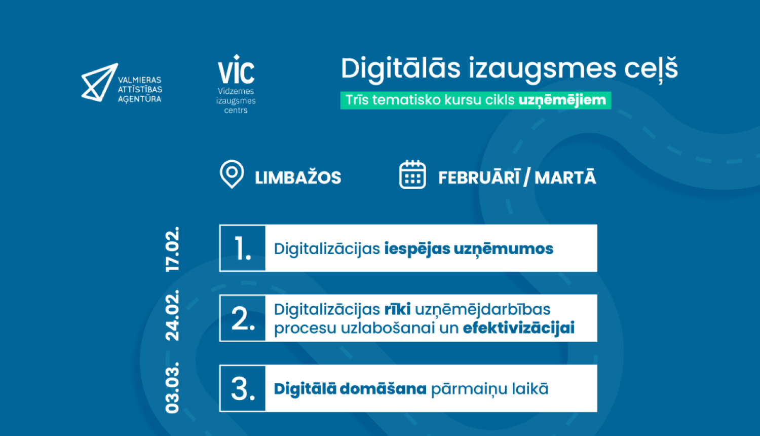 Februārī Limbaži kļūs par nākamo pieturu ceļā uz digitālo izaugsmi, nodrošinot iespēju vietējiem uzņēmumiem mērot tādu pašu trīs posmu ceļu kopā ar digitalizācijas ekspertu un treneri Aleksandru Ļubinski un komunikācijas un pārmaiņu vadības treneri Aiju Iesalnieci. Katrs posms atbilst vienai tematiskajai mācību dienai, un dalībnieki var izvēlēties apmeklēt vienu, divas vai visas trīs mācību dienas, kas notiks otrdienās – 17., 24. februārī un 3. martā no plkst. 9.30 līdz 15.30 Limbažu novada Galvenās bibliotēkas telpās.