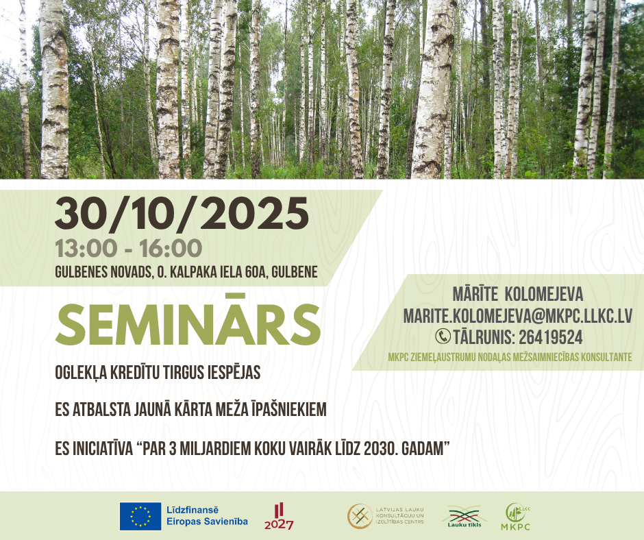 Aicinām uz informatīvo semināru “Oglekļa kredītu tirgus iespējas, ES atbalsta jaunā kārta meža īpašniekiem, ES iniciatīva “Par 3 miljardiem koku vairāk līdz 2030. gadam”