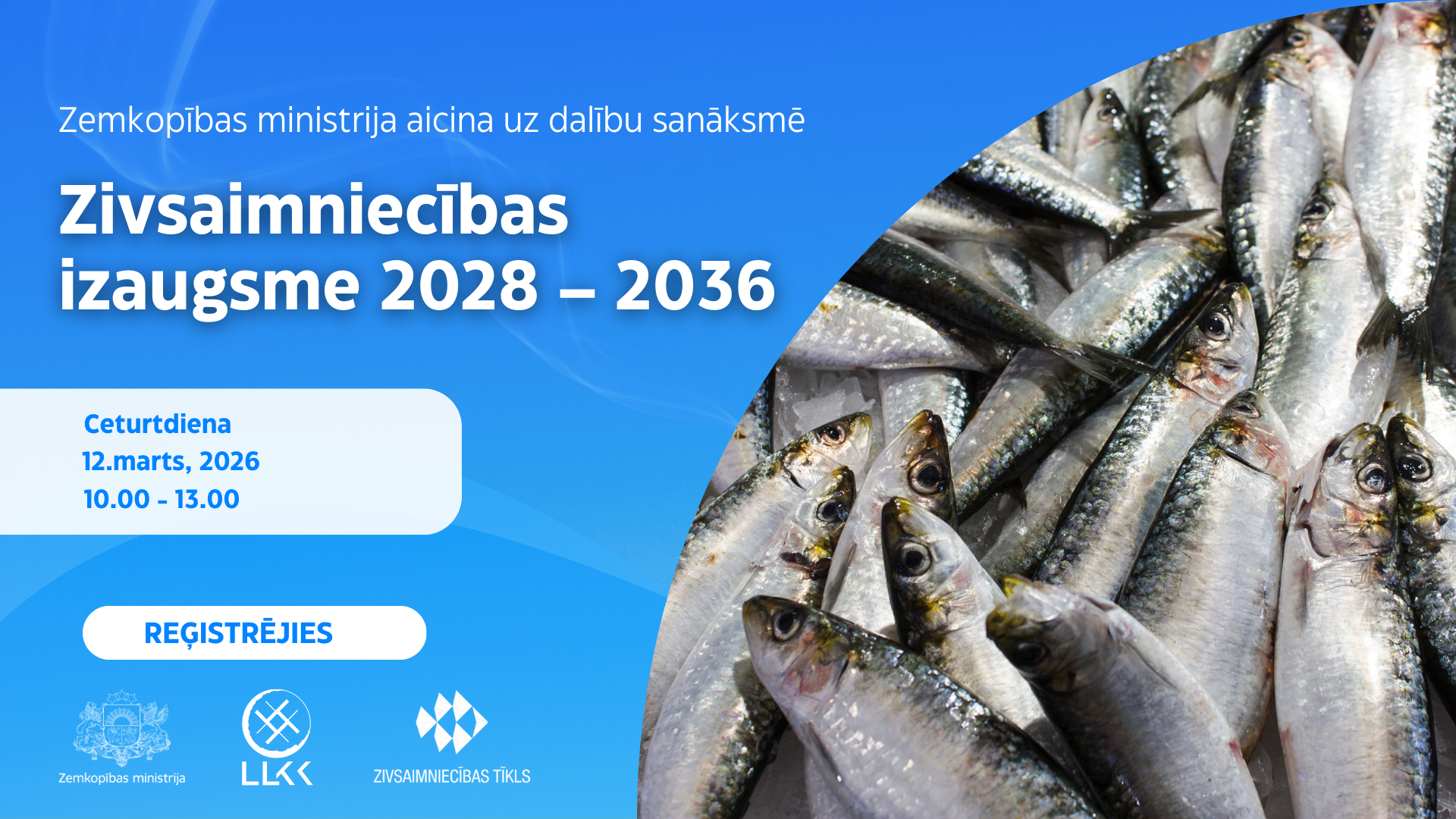 Zemkopības ministrija sadarbībā ar Latvijas Lauku konsultāciju un izglītības centru (LLKC) šā gada 12. martā rīko plašu sanāksmi “Zivsaimniecības izaugsme 2028–2036”. Pasākums norisināsies Zemkopības ministrijas telpās no pulksten 10.00 līdz 13.00, un tajā aicināti piedalīties nozares profesionāļi, organizāciju pārstāvji un visi interesenti, kuriem rūp zivsaimniecības sektora ilgtermiņa attīstība.