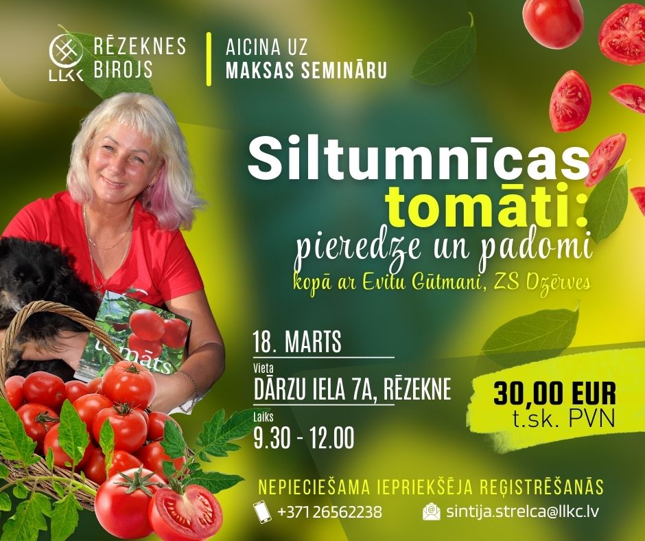 Kā izaudzēt tomātus, lai gūtu vēlamo rezultātu? Uz šo jautājumu atbildi meklē ne viens vien šī dārzeņa audzētājs. Tāpēc Rēzeknes konsultāciju birojs interesentus aicina uz semināru, kurā ar savām zināšanām dalīsies pieredzes bagātā tomātu audzētāja Evita Gūtmane no Jelgavas puses.