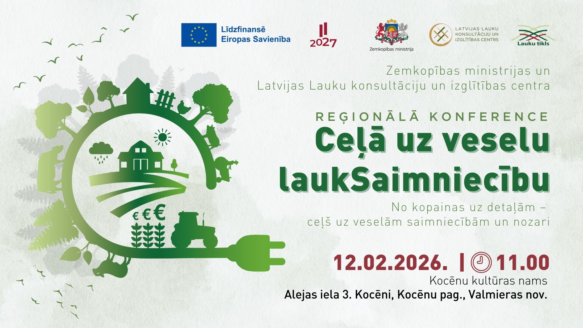 Zemkopības ministrija kopā ar LLKC 12. februārī, Vidzemes reģionā, Kocēnu kultūras namā, rīko reģionālo konferenci “Ceļš uz veselu laukSaimniecību”, lai runātu par Latvijas lauksaimniecības nākotni un to, kā padarīt saimniecības noturīgas un ilgtspējīgas.